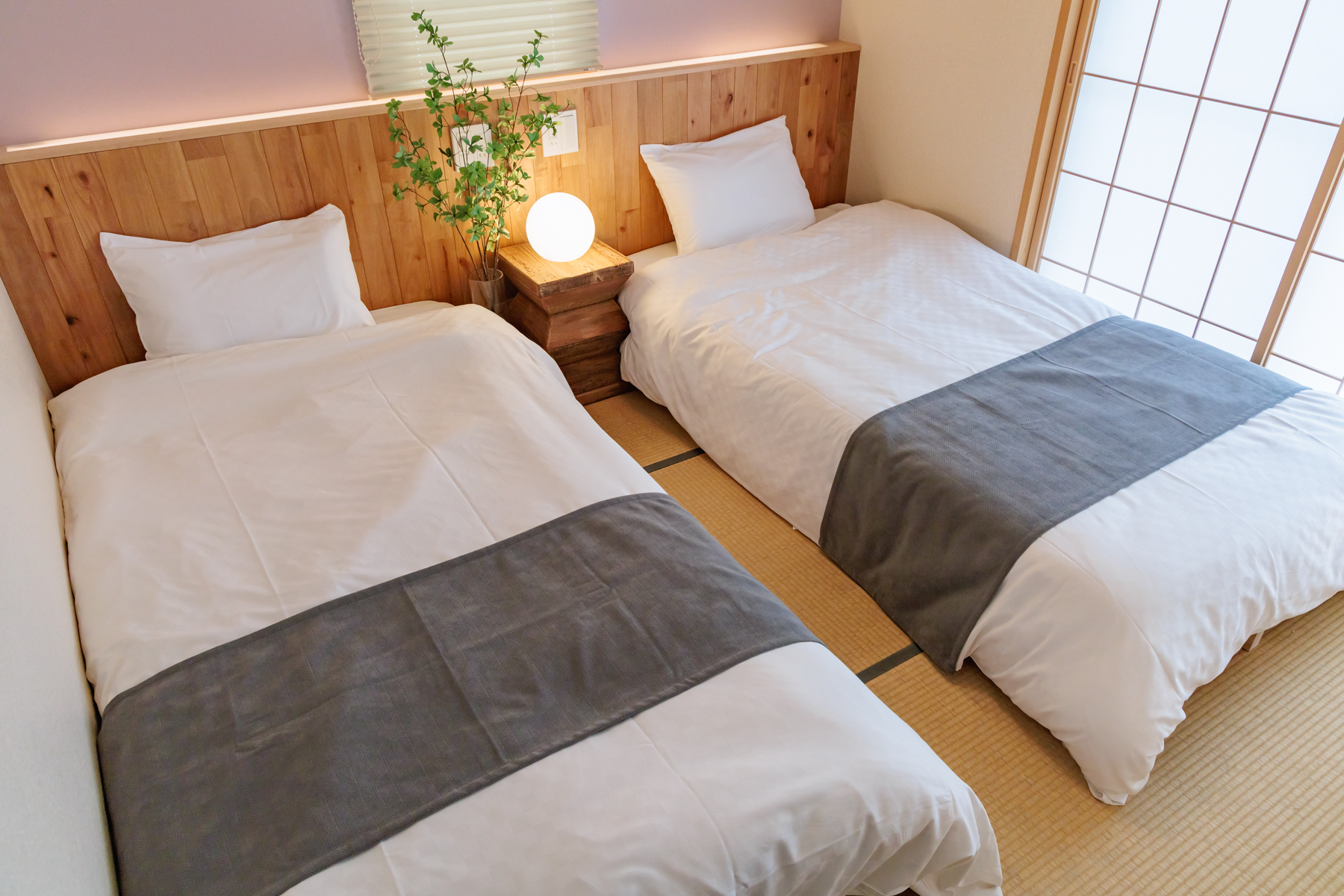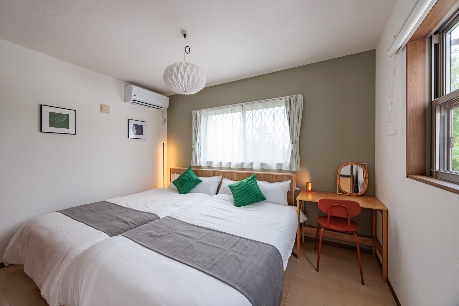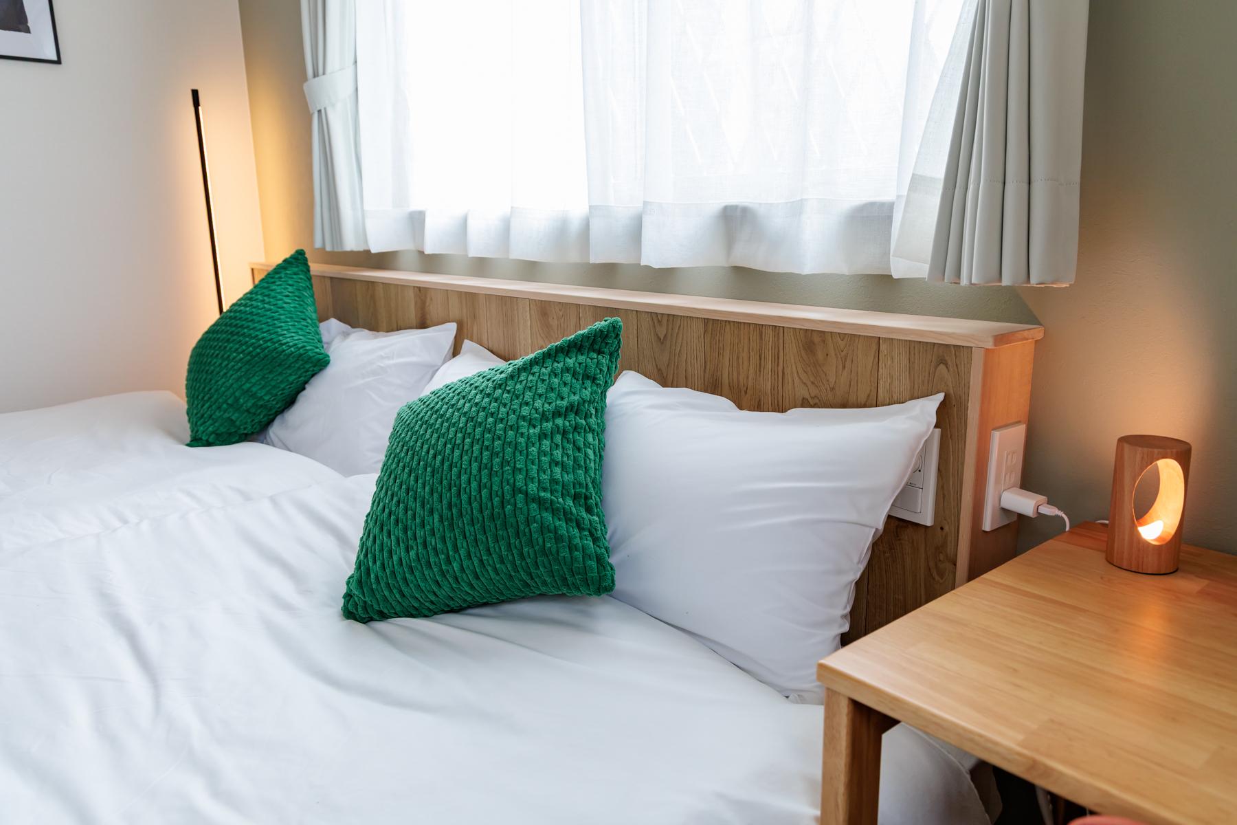 セミダブルベッド2台とデスク。ワーケーションや読書時間にも最適な、静けさに包まれた空間です。