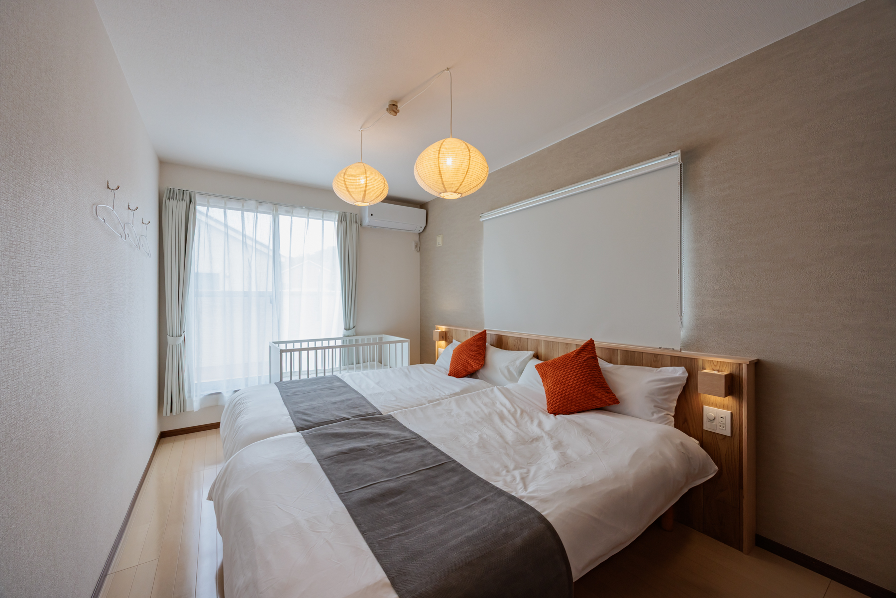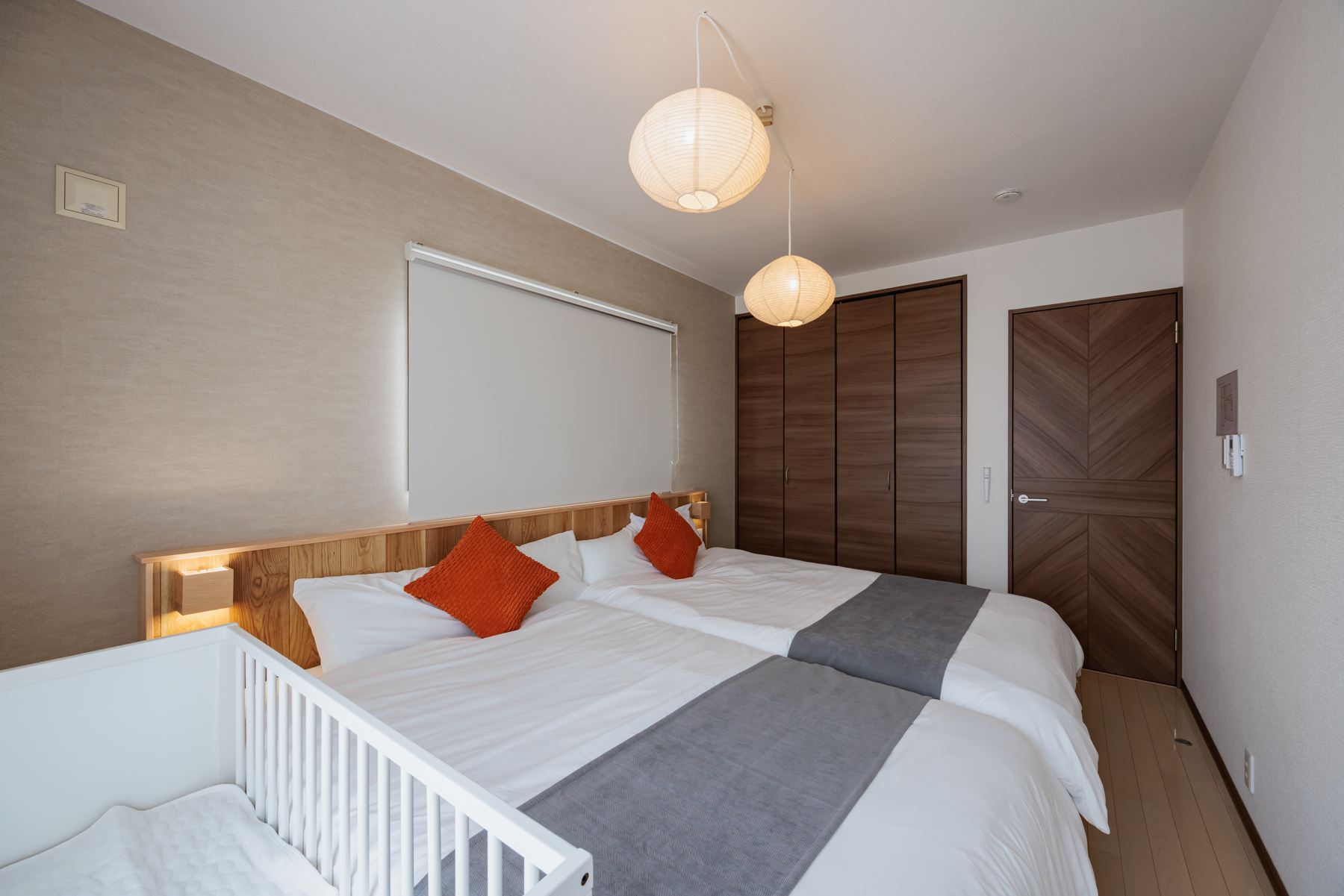 セミダブルベッド2台にベビーベッドを備えた、ご家族向けのお部屋。 やわらかな灯りと木の質感が安心感を与え、親子で心地よい眠りをサポートします。